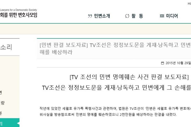 법무법인 지향 류신환/김묘희 변호사가 민주사회를 위한 변호사모임을 대리하여, 조선방송을 상대로 한 정정보도 청구소송을 진행하여 승소 판결을 받았습니다 ************************************ 2015. 10.…