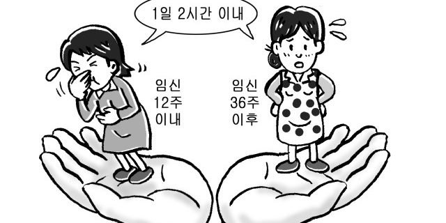 근로기준법 제74조 제7항과 제8항에 의하면, 임신한 지 12주가 지나지 않은 산모나 임신한 지 36주가 지난 산모는 회사에 1일 2시간까지 근로시간을 줄여 달라고 신청할 수 있습니다. 회사 사장님은 이런 신청을 받으면 반드시 허용해야 합니다.(단, 1일 근로시간이 8시간 미만인 근로자인 경우에는 1일 근로시간이 6시간이 되도록 할 수 있습니다.)