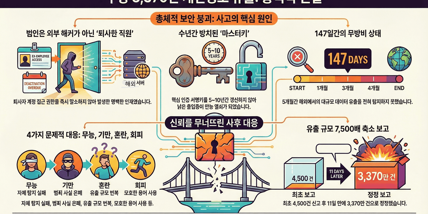 - 무능 (탐지 실패): 쿠팡은 자체 보안 시스템이 아닌, 유출범에게 직접 협박당한 고객의 문의를 받고서야 5개월간 이어진 유출 사실을 처음 인지했습니다.