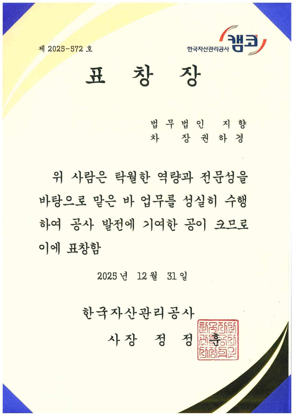 1월262026 지난 2025년, 법무법인 지향의 김예지 변호사, 권하경 차장이 한국자산관리공사(KAMCO)로부터 그 간 공로를 인정받아 표창장을 수여받았습니다. By jihyanglaw2026년 1월 26일관련소식[언론보도] 법무법인지향, 공정위의 노조탄압에 제동, 건설노조 대리하여 전부승소판결2026년 1월 27일[소식] 법무법인 지향, 한국여성의전화, ‘특별상’ 수상(최말자님 재심사건 관련)2026년 1월 27일[언론보도] 법원 “2인 방통위” KBS 이사 임명은 부적절2026년 1월 26일[보도자료] 소비자 보호를 위한 집단소송법 제정연대 출범 기자회견2026년 1월 15일[언론보도] 개인정보위 “쿠팡, 자체조사 결과 홈페이지 공지 중단해야”_법무법인 지향 시정조치 수용2026년 1월 15일[보도자료] 법무법인 지향, 쿠팡의 허위 ‘수정 유출 통지’ 및 ‘허위 유출통지를 전제로 한 기만적 보상’에 대해 개인정보보호위 · 공정위 긴급 시정명령 촉구(1.15.전 시정명령 촉구)2026년 1월 8일